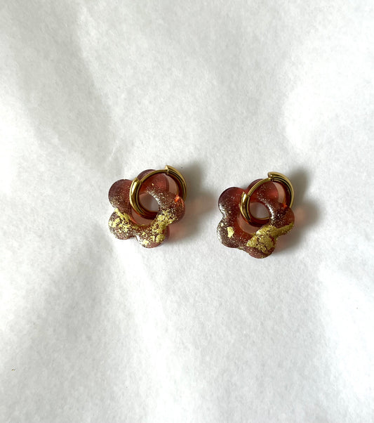 Pampille l créoles dorées et sa fleur rose poudrée et feuille dorées