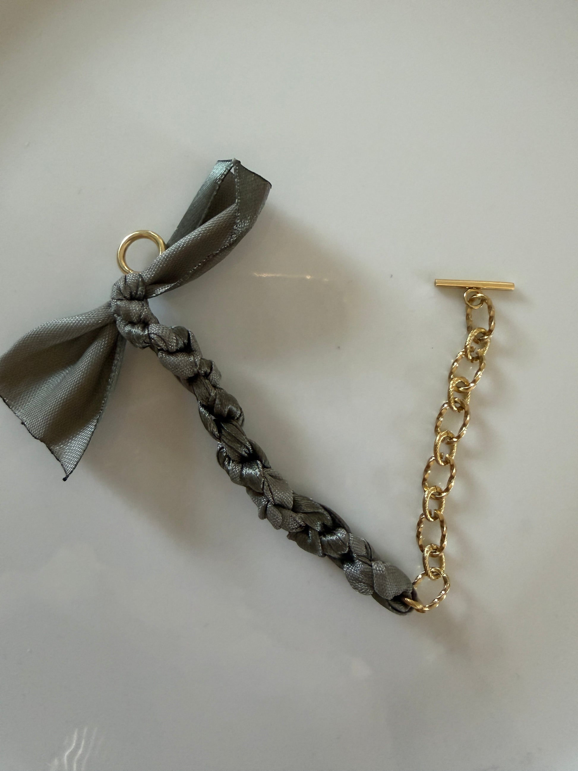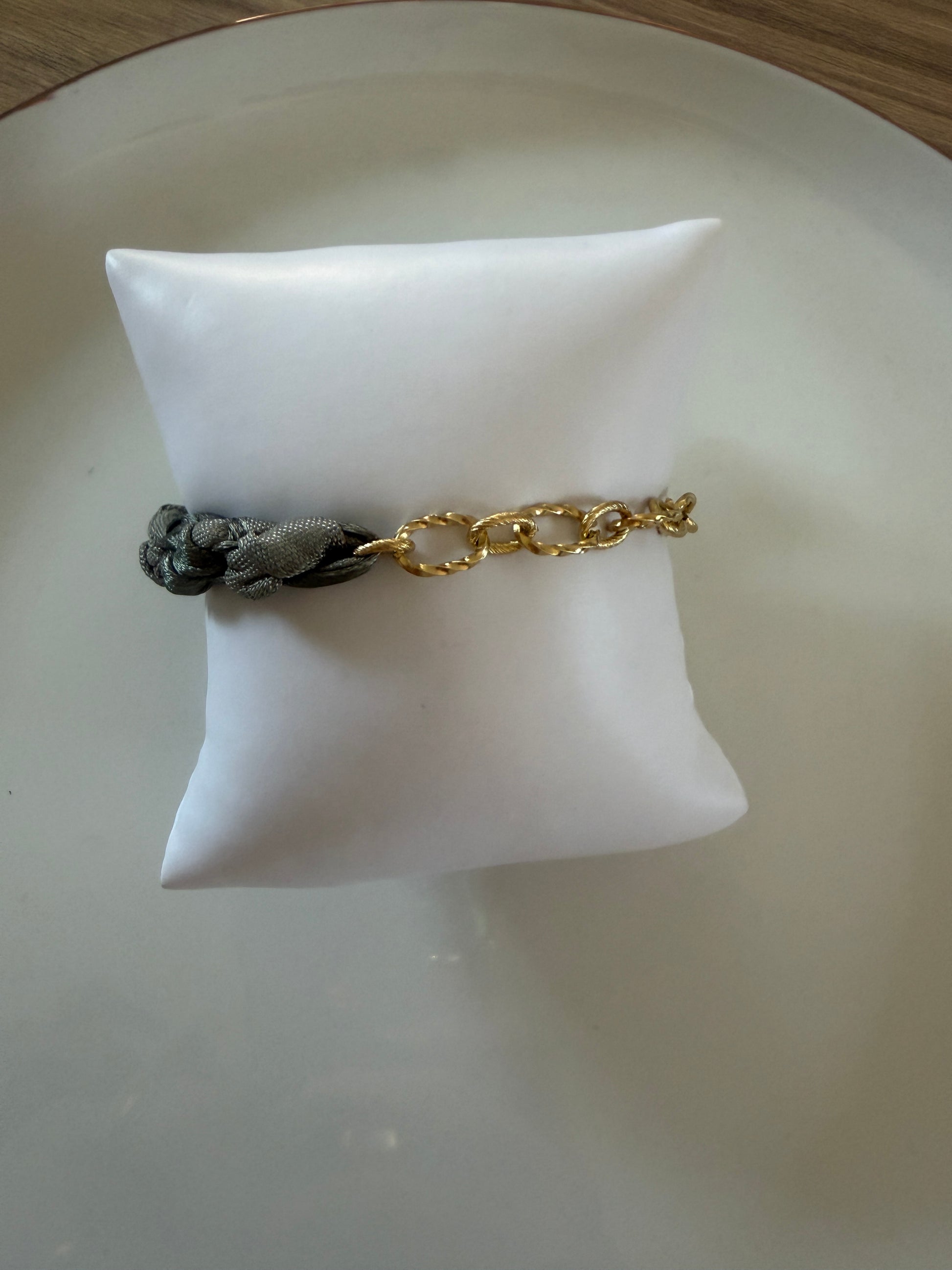 Succombez à l'élégance de ce joli bracelet unique avec sa chaîne dorés en acier inoxydable 304 plaqué à l'or fin 18k et son ruban kaki tressé.
