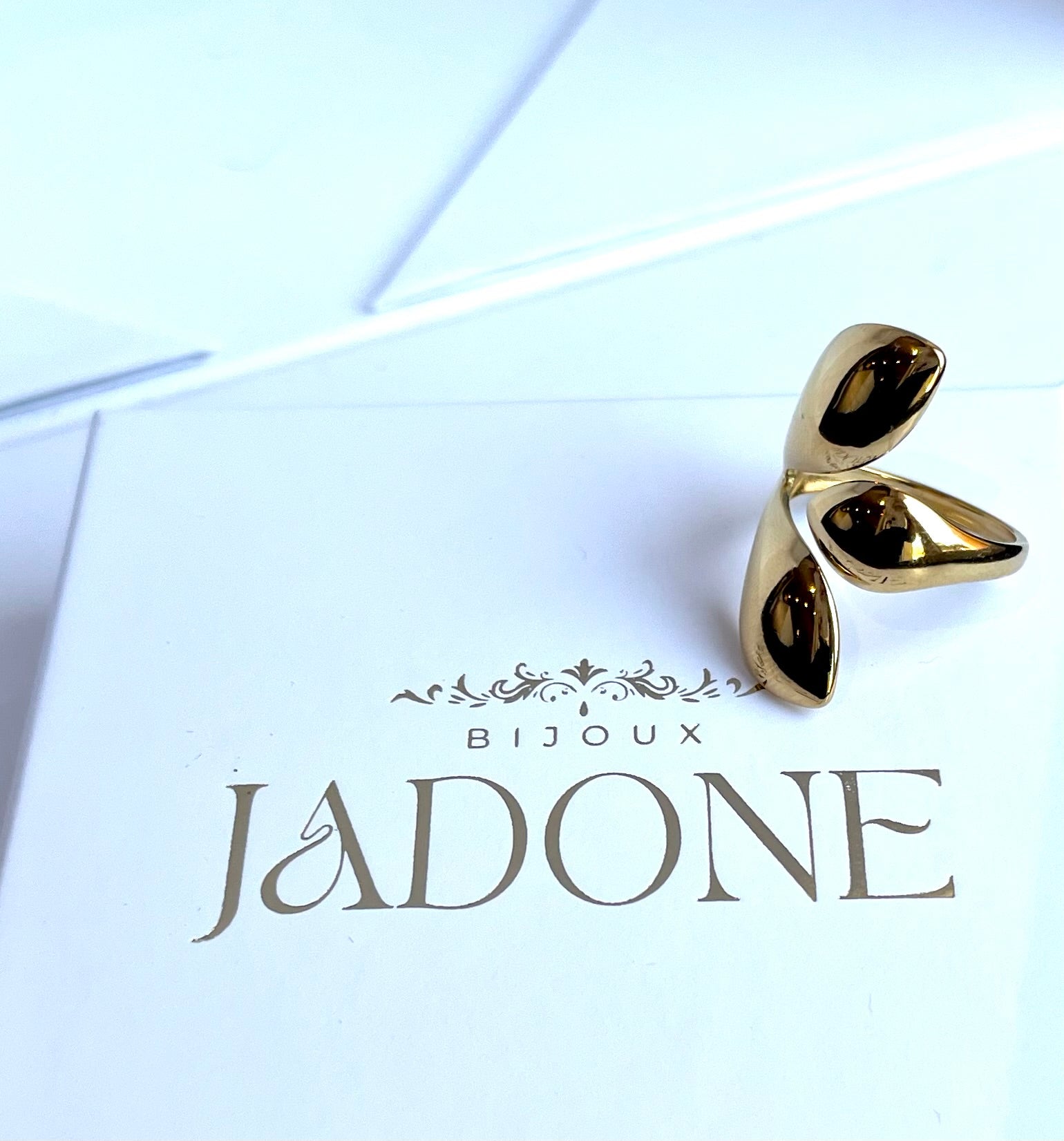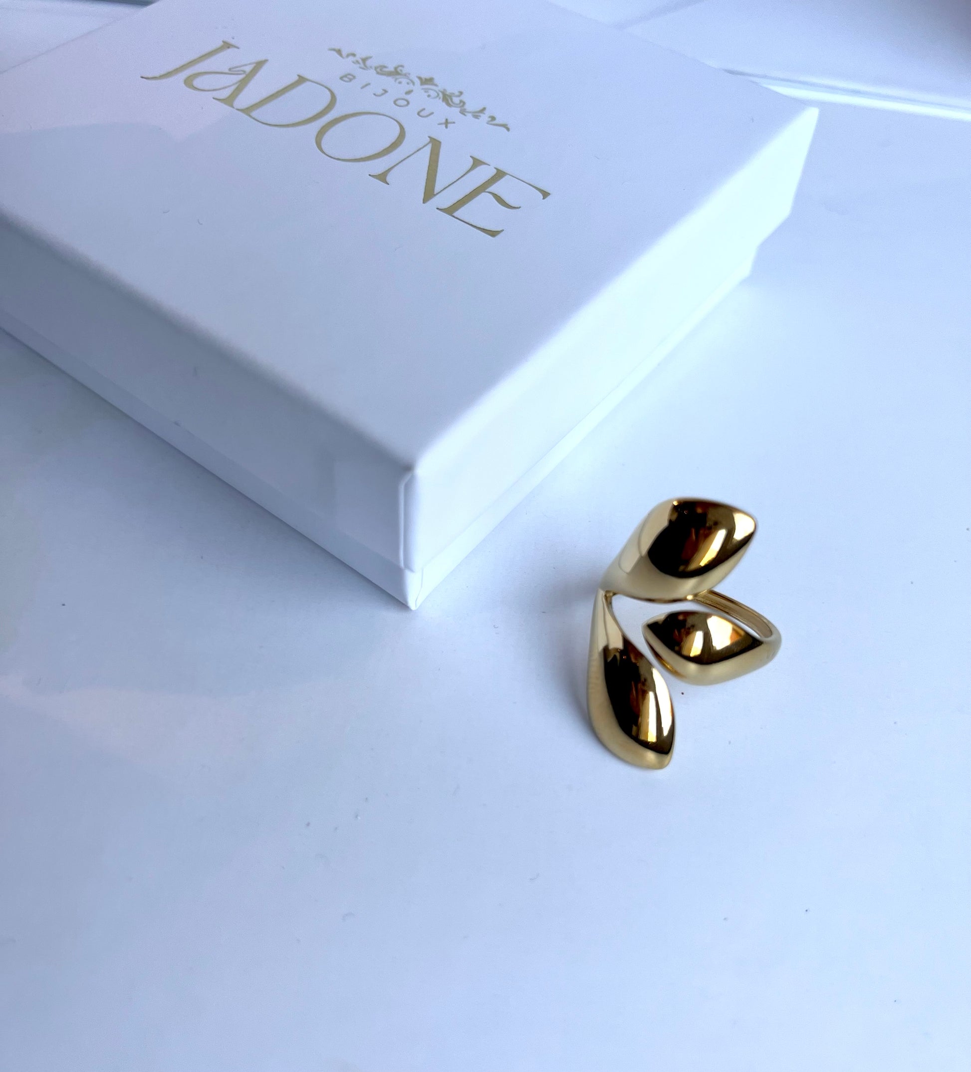 En acier inoxydable 304 plaqué à l'or fin 18k, cette bague mesure 3cm de longueur sur 1,75 cl de diamètre