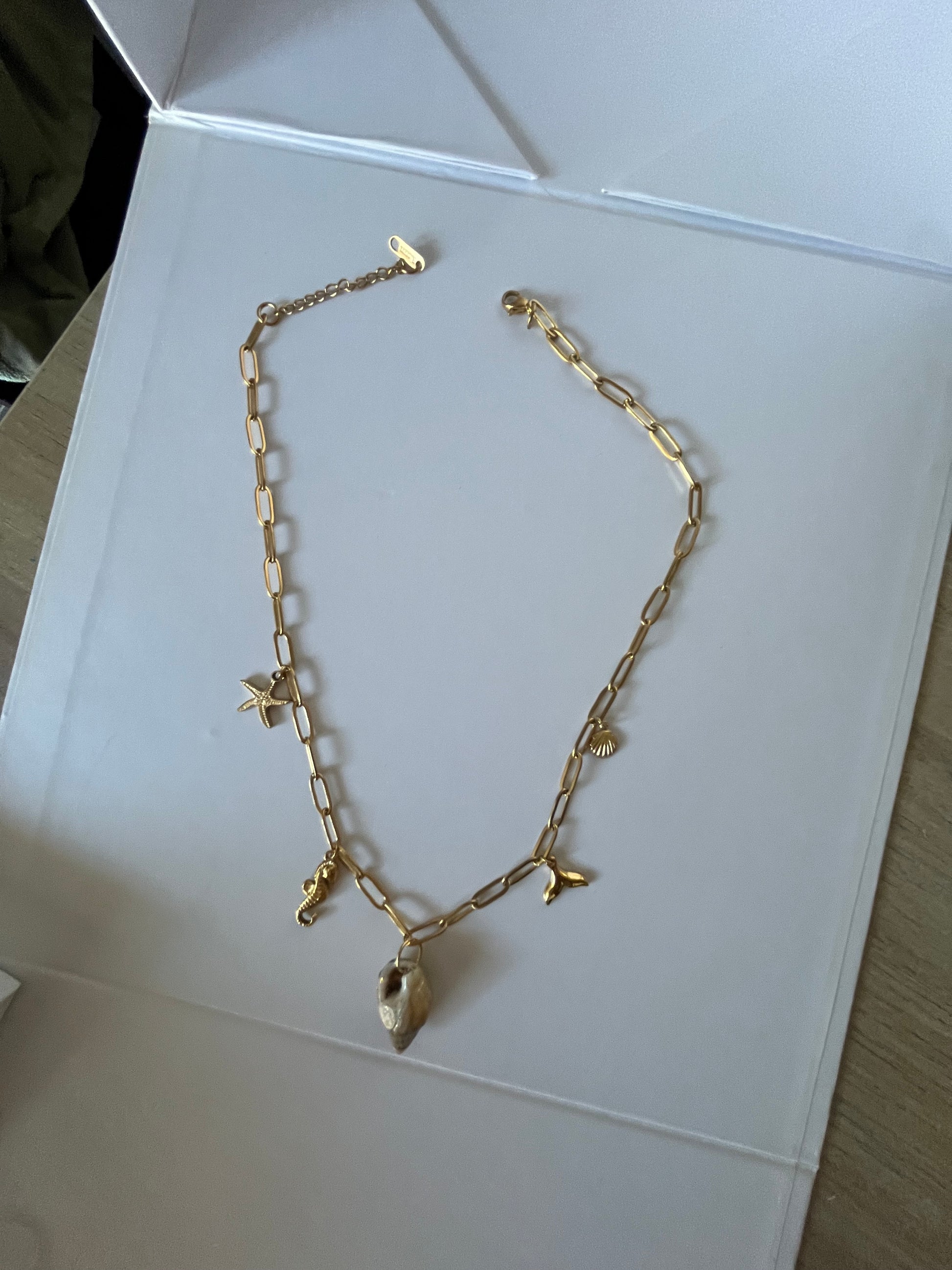 Craquez pour cet élégant collier Charme doré en acier inoxydable 304 , son coquillage des plages de Normandie travaillé à la main et ses feuilles dorées.